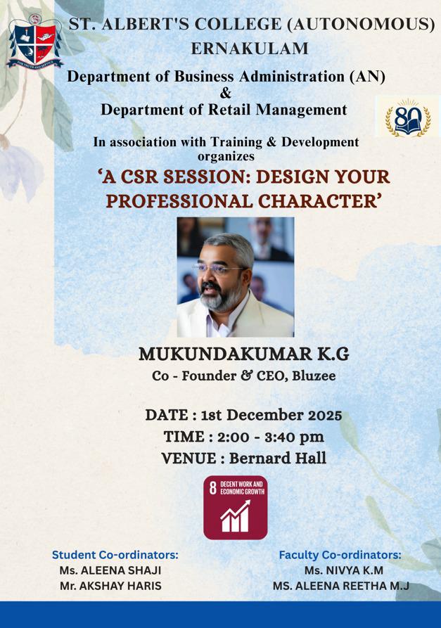 St. Albert’s College (Autonomous) works with a powerful vision to be a centre of excellence through the process of self-evaluation and continual renewal in all endeavours, namely learning, teaching, research, consultancy and other related services and an empowering mission to equip young people to meet the challenges of modern times, existing for students by providing a most friendly and growth-oriented ambience.