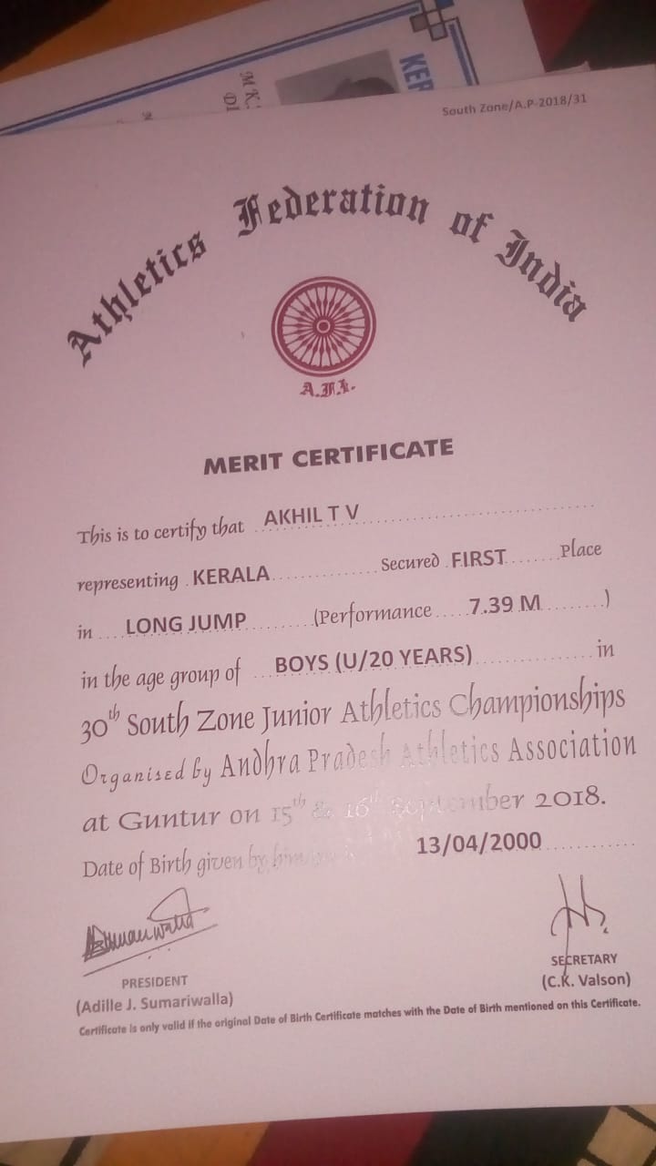 7 | 15/09/2018 – 16/09/2018 | First Prize | Individual | Inter Zone | Long Jump, 30th South Zone Junior Athletics Championships, Guntur | Akhil T V | II BSc Physics |  |
