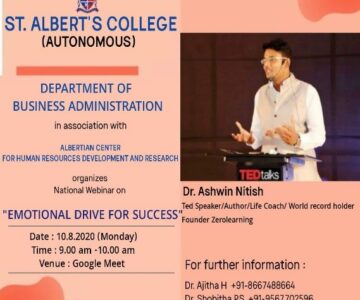 The Department of Business Administration, St. Albert’s College (Autonomous) Ernakulam in association with the Albertian Centre for Human Resource Development andΒ Research organised a National Webinar on Emotional Drive for Success on the 10th of August, 2020. The session was led by Dr. Ashwin Nitish, TED Speaker, Author, Life coach, World Record holder and Founder of Zerolearning. The webinar was coordinated by Dr. Ajitha and Dr. Shobitha P S of the Department of Business Administration.