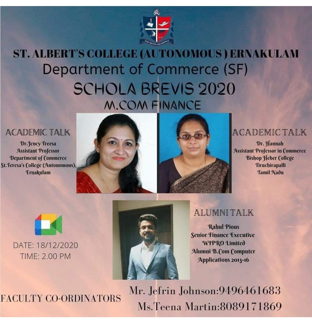 The Academic Talk taken by Dr. Jency Treesa, Assistant Professor, the Department of Commerce, St. Teresa’s College (Autonomous), Ernakulam. The Industrial Talk was delivered by Dr. Hannah, Assistant Professor of Commerce, Bishop Heber College, Tiruchirapalli, Tamil Nadu. The Alumnus Talk was delivered by Mr Rahul Pious, Senior Finance Executive, WIPRO Ltd., and an Alumnus of the 2013-16 batch.