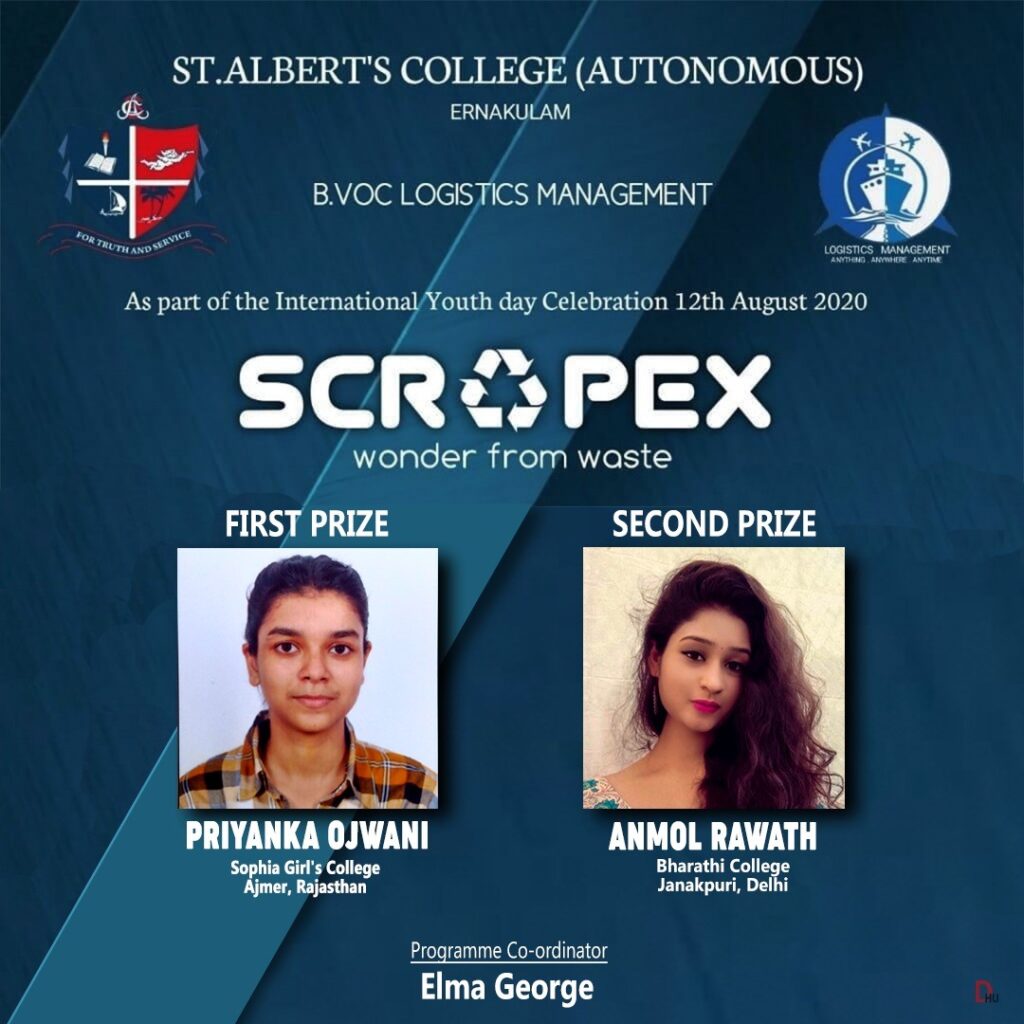 As part of the International Youth Day, the Department of B.Voc Logistics Management of St. Albert’s College (Autonomous), Ernakulam conducted a National level competition “SCRAPEX’’ for young minds to portray different ways of creatively reusing waste materials. The competition was conducted on the10th of August, 2020. The theme for the event was Wonder from Waste Material. Ms. Priyanka Ojwani of Sophia Girl’s college Ajmeer, Rajasthan secured the First prize and Ms. Anmol Rawat of Du Bharti College, Janakpuri , Delhi secured the Second prize in the competition.