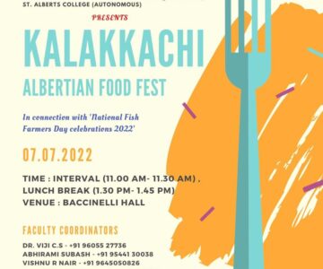 Albertian Fisheries Food Fest “KALAKKACHI” conducted by the Research Department of Fisheries and Aquaculture on the 7th of July in commemoration of National Fish Farmer’s Day, which is celebrated on July 10th every year. *Date: July 7* *Time : 11:00 – 11:30 AM and 1:30- 1:45 PM* *Venue: Baccinelli Hall, St. Albert’s College (Autonomous) Ernakulam.*