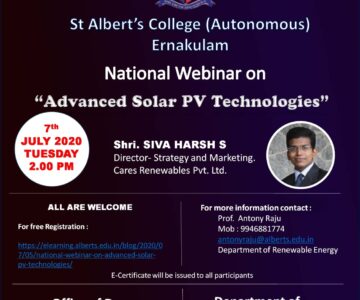 The Department of Renewable Energy, St Albert’s College (Autonomous), Ernakulam in association with the Office of Dean, Training & Development, organized a National webinar on Advanced Solar PV Technologies. The resource person for the webinar was Mr. Siva Harsh, Director, Strategy and Marketing, Cares Renewables Pvt Ltd, Coimbatore. He has won many awards like the EcoEnergy Annual Excellence Award, Ashoka Trust-Khoshoo Earthian Trophy and was also the Runner-up at the V-Guard Big Idea Business Plan Contest. The Webinar was co-ordinated by Mr. Antony Raju (IEDC Coordinator of the Department). There were around 200 participants for the webinar from the industry as well as other educational institutions.