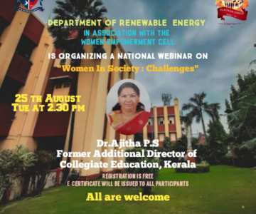 The Department of Renewable Energy, St Albert’s College (Autonomous), Ernakulam in association with Women Empowerment Cell of the college organised a National webinar on Women in Society: Challenges on August 25th, 2020 as a part of celebrating Womenβs Equality Day. The resource person for the day was Dr. Ajitha P S, Former Additional Director of Collegiate Education. She holds a Doctorate Degree in Inorganic Chemistry from Mahatma Gandhi University, Kottayam. She served as a Principal in various Government colleges in Kerala and was also the Government nominee in various interview boards of Kerala PSC and was elevated to the position of Deputy Director of Collegiate Education. Around 100 people participated in the webinar. The Webinar was coordinated by Mrs. Pearl Antonette Mendez, HOD In-charge, the Department of Renewable Energy.