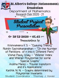 The twelfth meeting of Research Club 2020 was on on 18December, 2020 during which presentations were made by Vishal Pauly Vijay on Wiener Index and Wiener Polynomial for some Special Graphs, followed by Krishnaheera K S on Queuing Theory, Karthik N N on Graphs Determined by Polynomial Invariants, Rohith Sachidhanandhan on On the Number of Partitions of n into k Different Parts and Anjitha Manoj on Fourier Transform and it’s Applications.