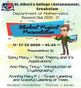The eleventh meeting of Research Club 2020 was on 17December, 2020 during which presentations were made by Sony Mary on Knot Theory and its Applications, followed by Ann Mary Tincy on Introduction to Cryptography and Amritha Mary P J on Graph Labelling and Graceful Labelling of Trees.