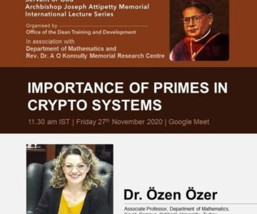 14th International Lecture in the series is on *Importance of Primes in Crypto Systems*  by *Dr. Özen Özer*, Associate Professor, Department of Mathematics, Kayalı Campus, Kırklareli University, Turkey on Friday 27th November 2020 from 11.30 am organized in association with Department of Mathematics and Rev. Dr. AO Konnully Memorial Research Centre.  Online registration link is as follows: