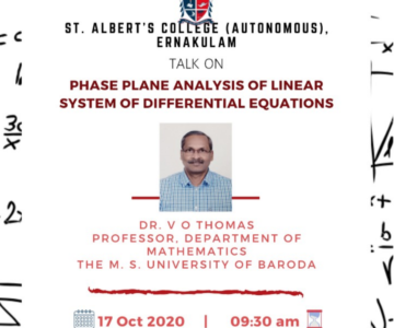 On 17th October 2020, The Department of Mathematics of St. Albert’s College (Autonomous), Ernakulam arranged a talk on Phase Plane Analysis of Linear System of Differential Equations on the 17th of October, 2020. The speaker for the day was Dr. V O Thomas, Professor, the Department of Mathematics, M S University of Baroda. He graduated from Kerala University and completed his PG, M.Phil and PhD from Sardar Patel University, Gujarat. He is a Research Guide and presented two papers in Mathematics and published articles in various journals. The talk was very useful especially for those who are preparing for the NET exam. The session was coordinated by Dr. Sabu M C, Head, the Department of Mathematics.