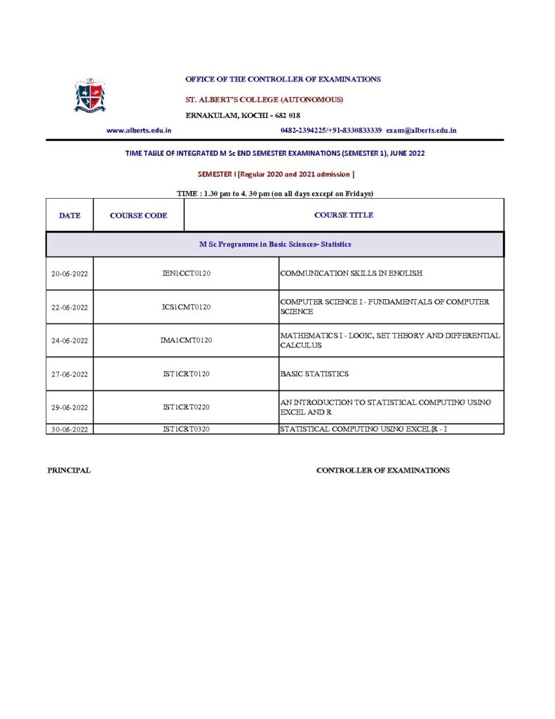 TIME TABLE OF INTEGRATED M Sc END SEMESTER EXAMINATIONS (SEMESTER 1), JUNE 2022 SEMESTER I [Regular 2020 and 2021 admission ]
