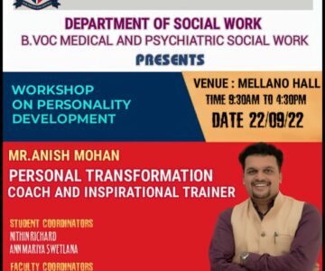 The Department of B. Voc Medical and Psychiatric Social work is conducting a one day Workshop on “Personality Development ” at Mellano Hall on 22 September, 2022.