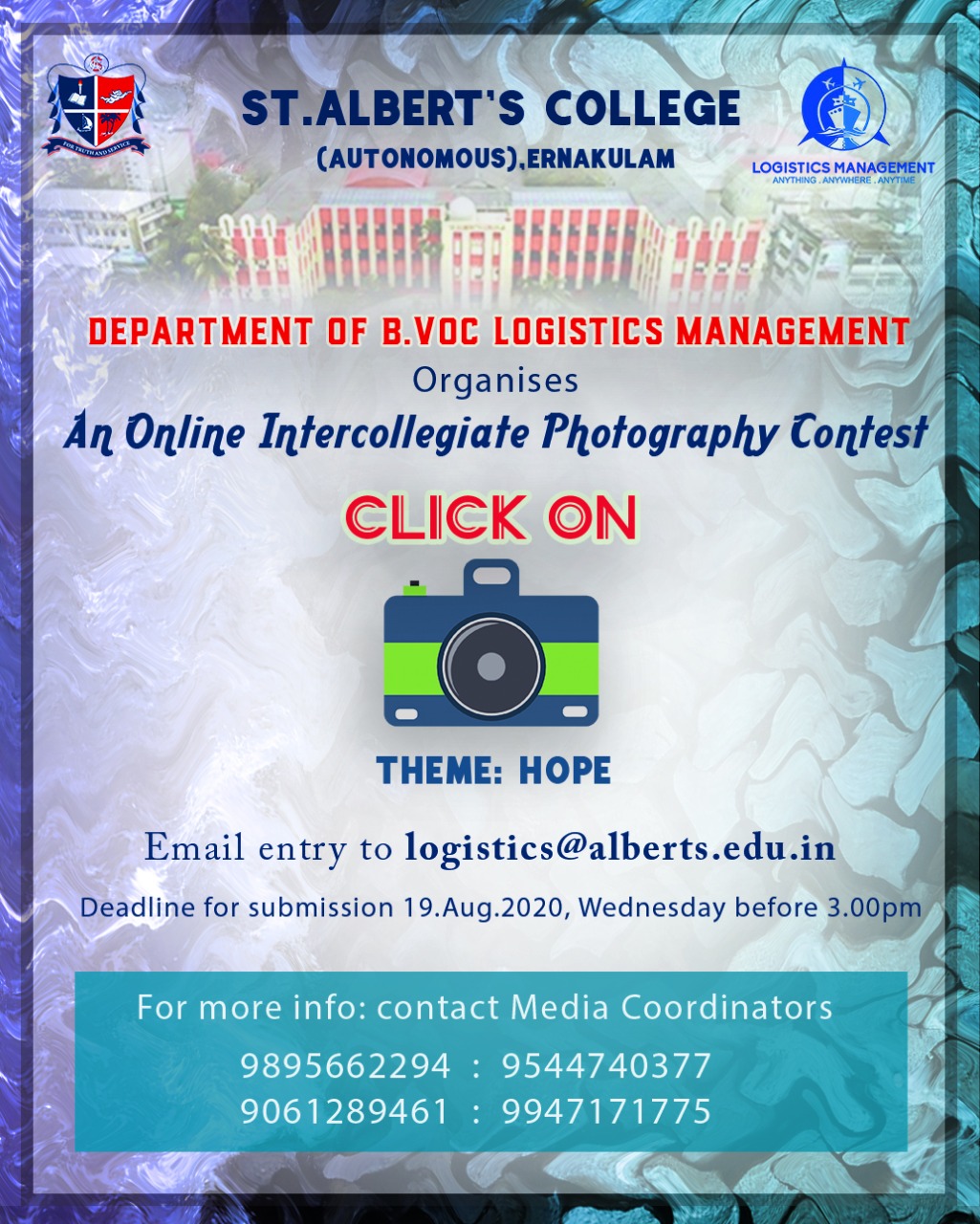 As a part of World Photography Day, the Department of B. Voc Logistics Management organised an intercollegiate photography contest βClick Onβ. The competition was held on 19th August, 2020. The theme for the event was Hope. 30 students of various colleges registered for the event. Mr. Anirudh Suresh was the winner of this event.Β The event was coordinated by the Media coordinators of the department under the guidance of Asst. Prof. Neenu Jose assisted by Ms. Riya Sequeira, Ms. Rosemary, Mr. Oliver Thadevus and Mr. Vishnu K S.Β